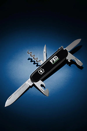 FXD HAVE COLLABORATED WITH ONE OF THE WORLD’S MOST RECOGNISED AND HIGHLY REGARDED KNIFE BRANDS, VICTORINOX. THE WORLD OF VICTORINOX DATES BACK TO THE YEAR 1884 WHEN KARL ELSENER OPENED A CUTLER’S WORKSHOP IN IBACH, SWITZERLAND. THE REVOLUTIONARY IDEA OF MANUFACTURING A COMPACT KNIFE WITH AN ARRAY OF PRACTICAL FUNCTIONS WAS A SUCCESS : THE SWISS ARMY KNIFE WAS BORN. THE LIMITED EDITION FXD X VICTORINOX SWISS ARMY KNIFE IS MADE IN SWITZERLAND BY VICTORINOX, IT IS A 12-FUNCTION POCKET KNIFE WITH A FXD X VICTORINOX EMBOSSED LEATHER POUCH AND LASER ETCHED MAIN BLADE.